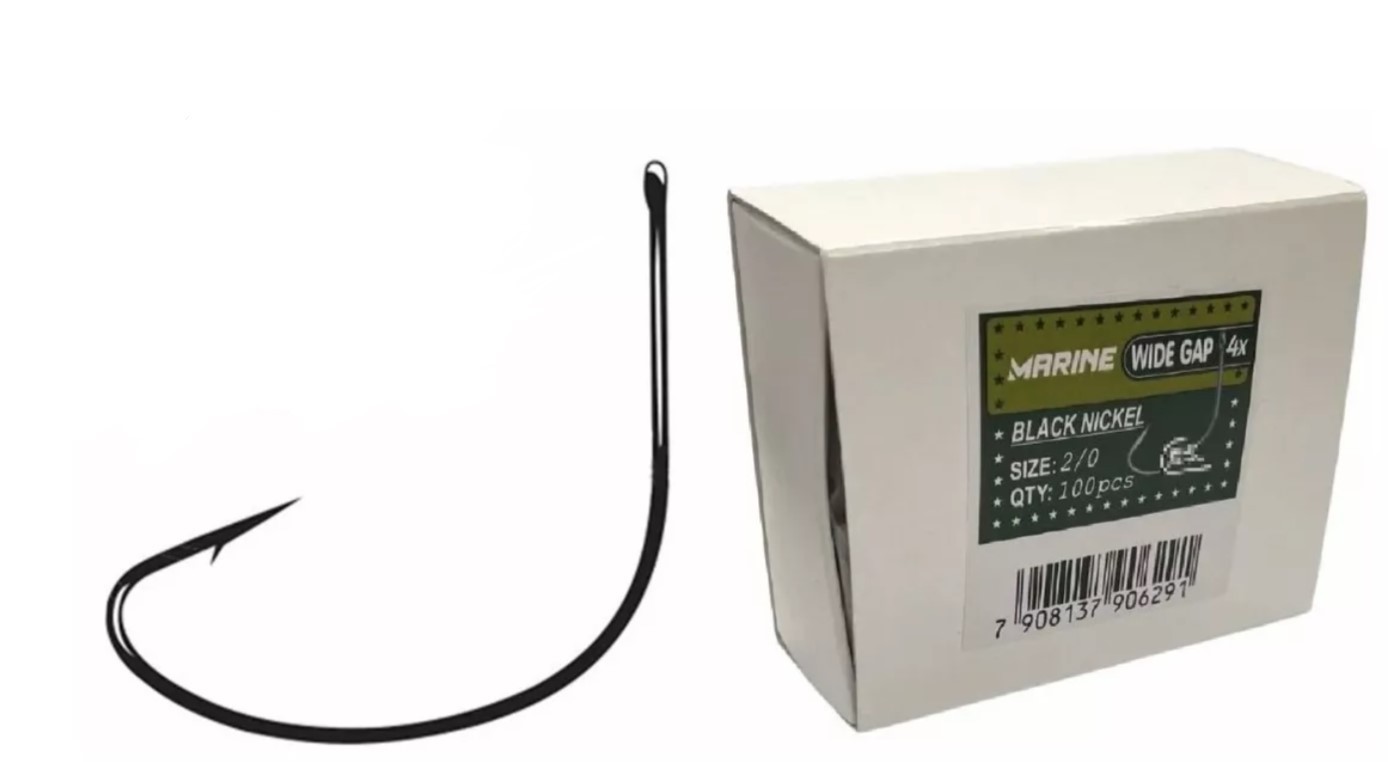 Anzol Wide Gap 4X N 2/0 Black Nickel Cx.100pçs Marine. Este anzol foi fabricado em Aço Carbono ultra resistente super afiado, desenvolvido exclusivamente para os amantes de pesqueiros que utilizam "anteninhas" para a captura dos grandes Tambaquis. Formato de anzol muito utilizado também com camarão vivo para pesca de robalos e tucunarés.