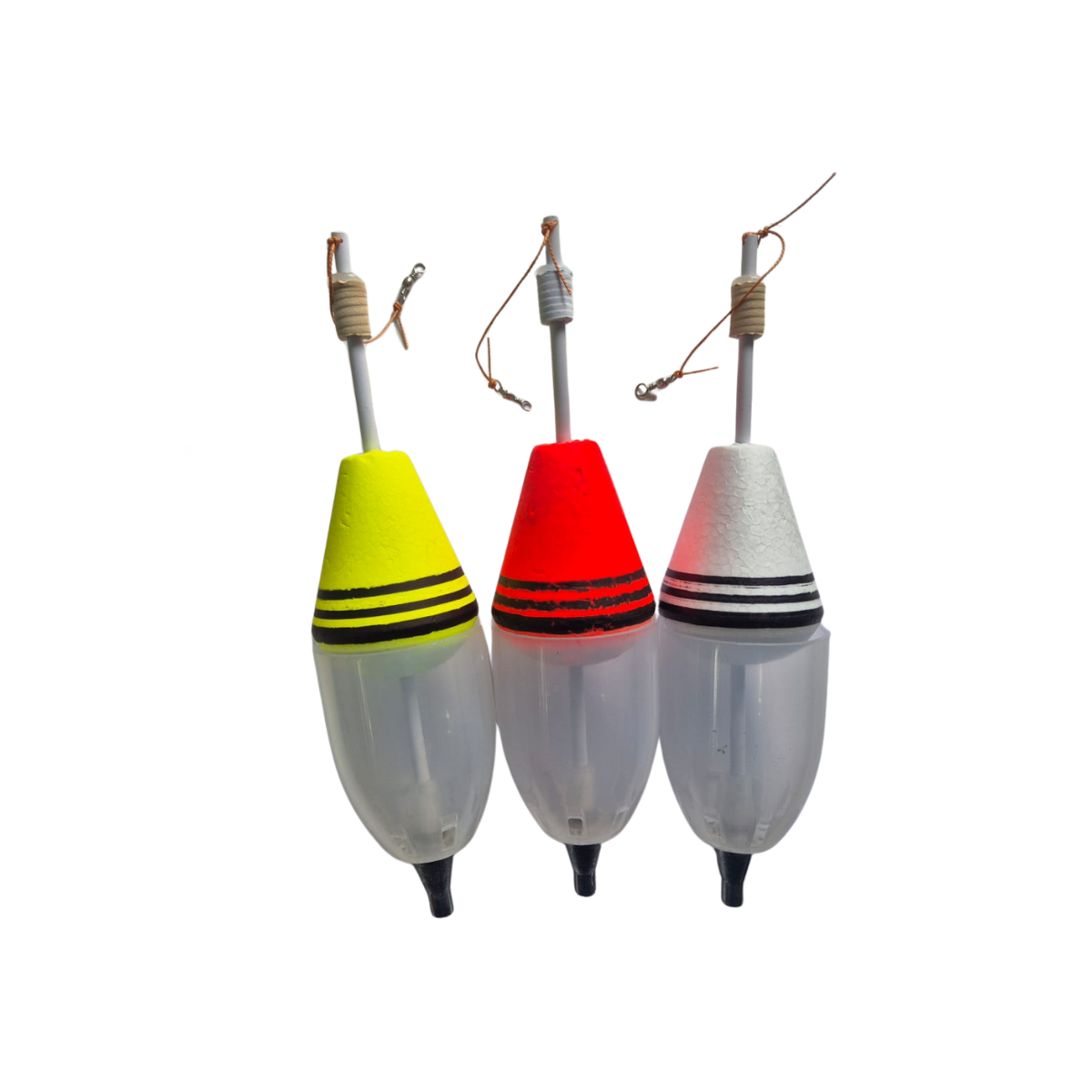 Boia usada em pesqueiros para arremessar ração junto com a isca. Possui copo para ração, peso de 65 g para arremessos longos e boa flutuação. Ao cair na água, libera a ração, atraindo os peixes para perto da isca. Ideal para pescaria de superfície.