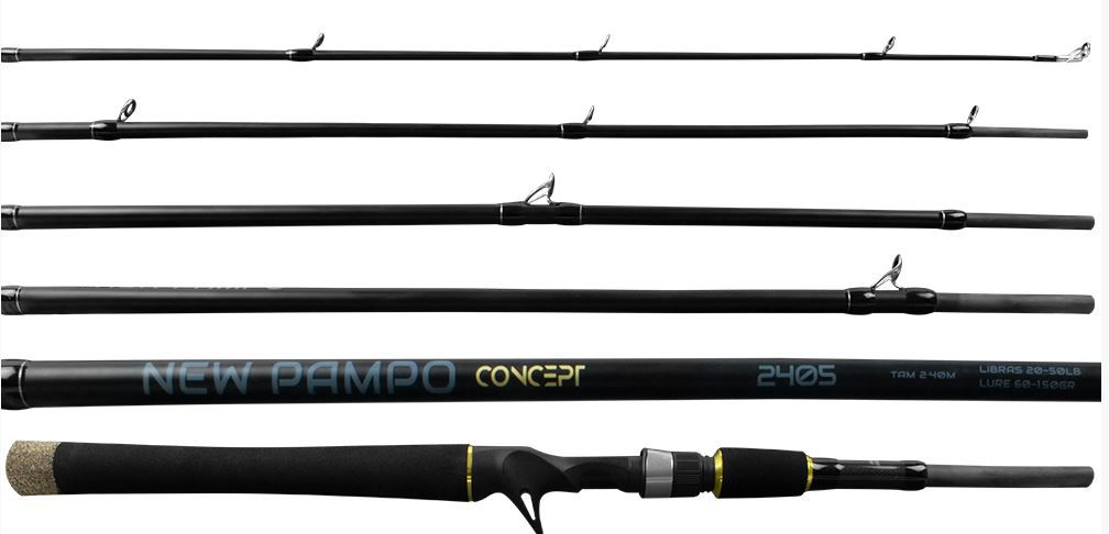 Passadores altamente resistentes de óxido de alumínio, a vara New Pampo concept com seu próprio nome já diz vem para introduzir no mercado uma nova concepção é dividida em 5 partes que facilita e muito o transporte, incluindo uma maleta super sofisticada para transporte é a preferida dos pescadores em pesqueiros.